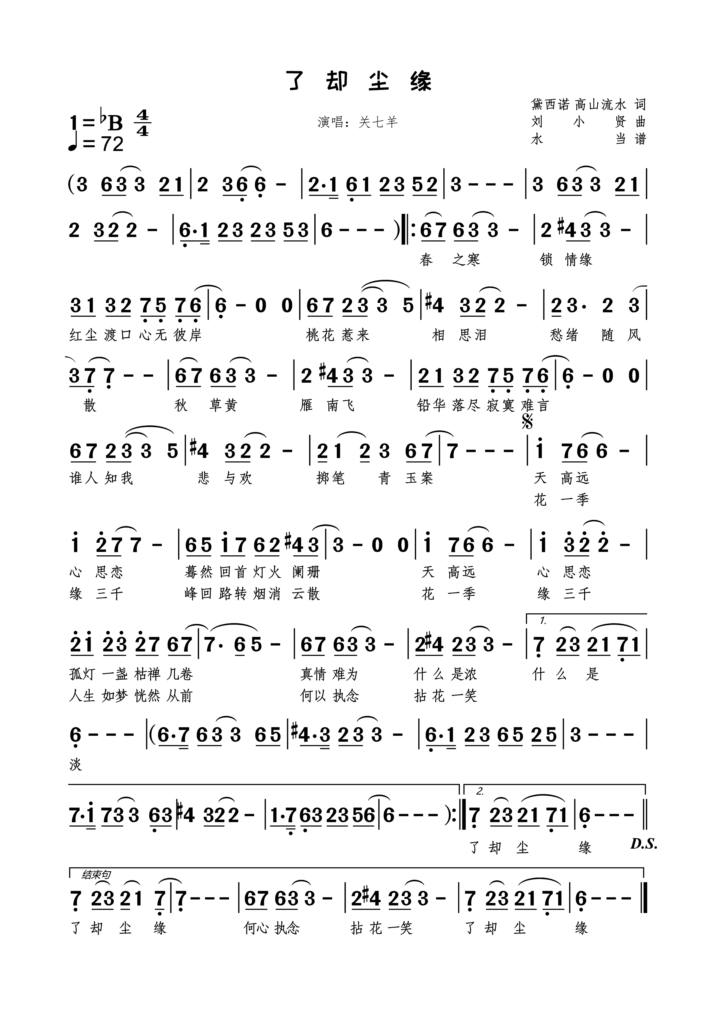 了却尘缘简谱下载关七羊演唱集西诺高山流水作词刘小贤作曲附歌词