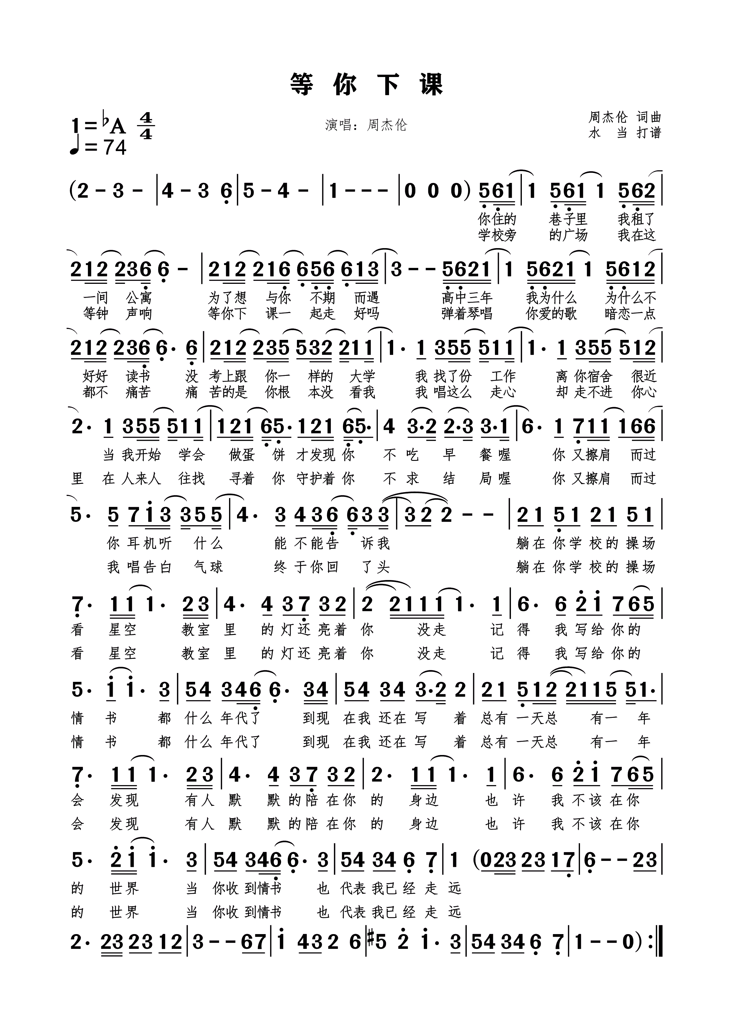 等你下课简谱下载周杰伦作词作曲演唱附歌词