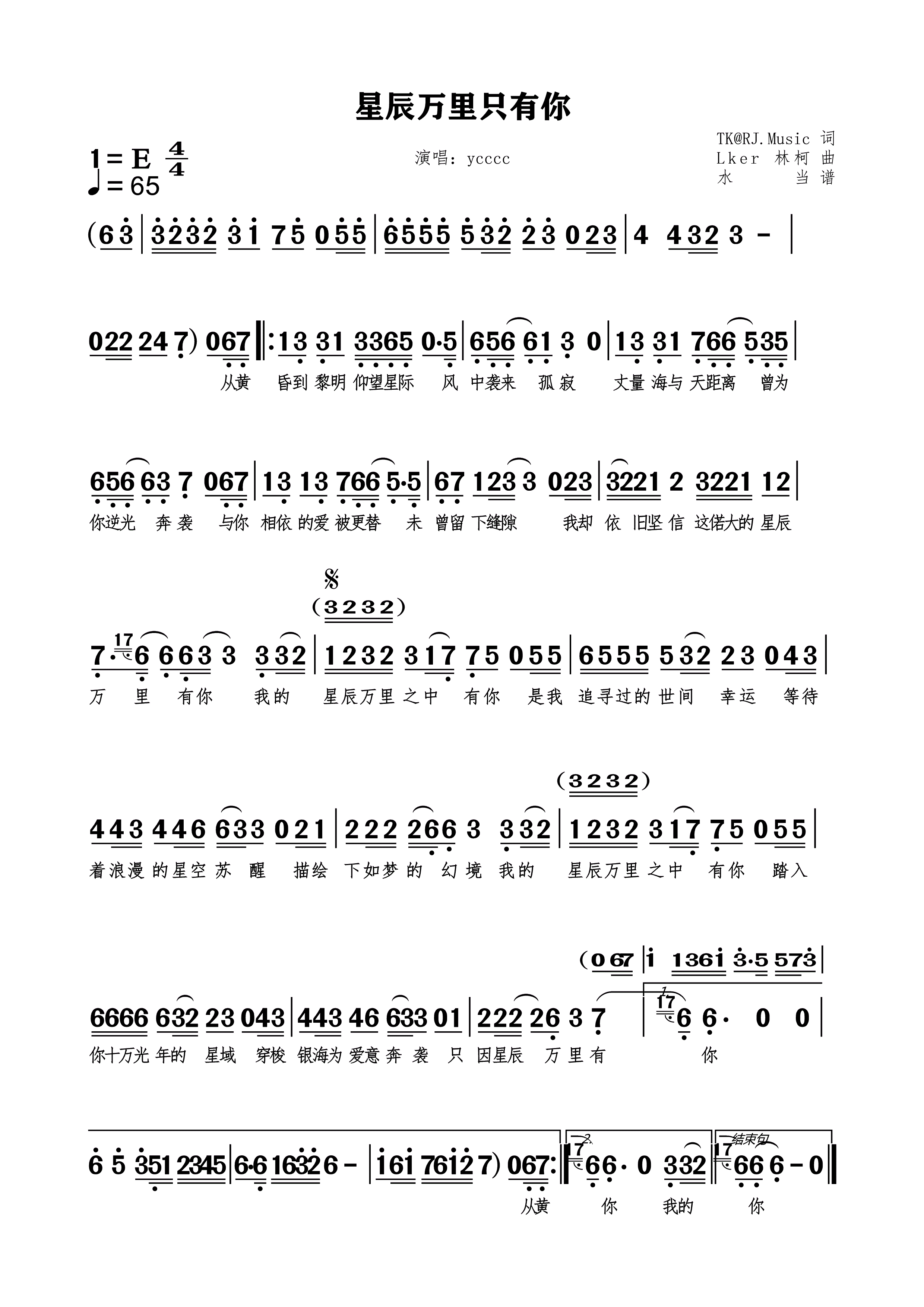 星辰万里只有你简谱下载ycccc演唱TK@RJ.Music作词Lker 林柯作曲附歌词
