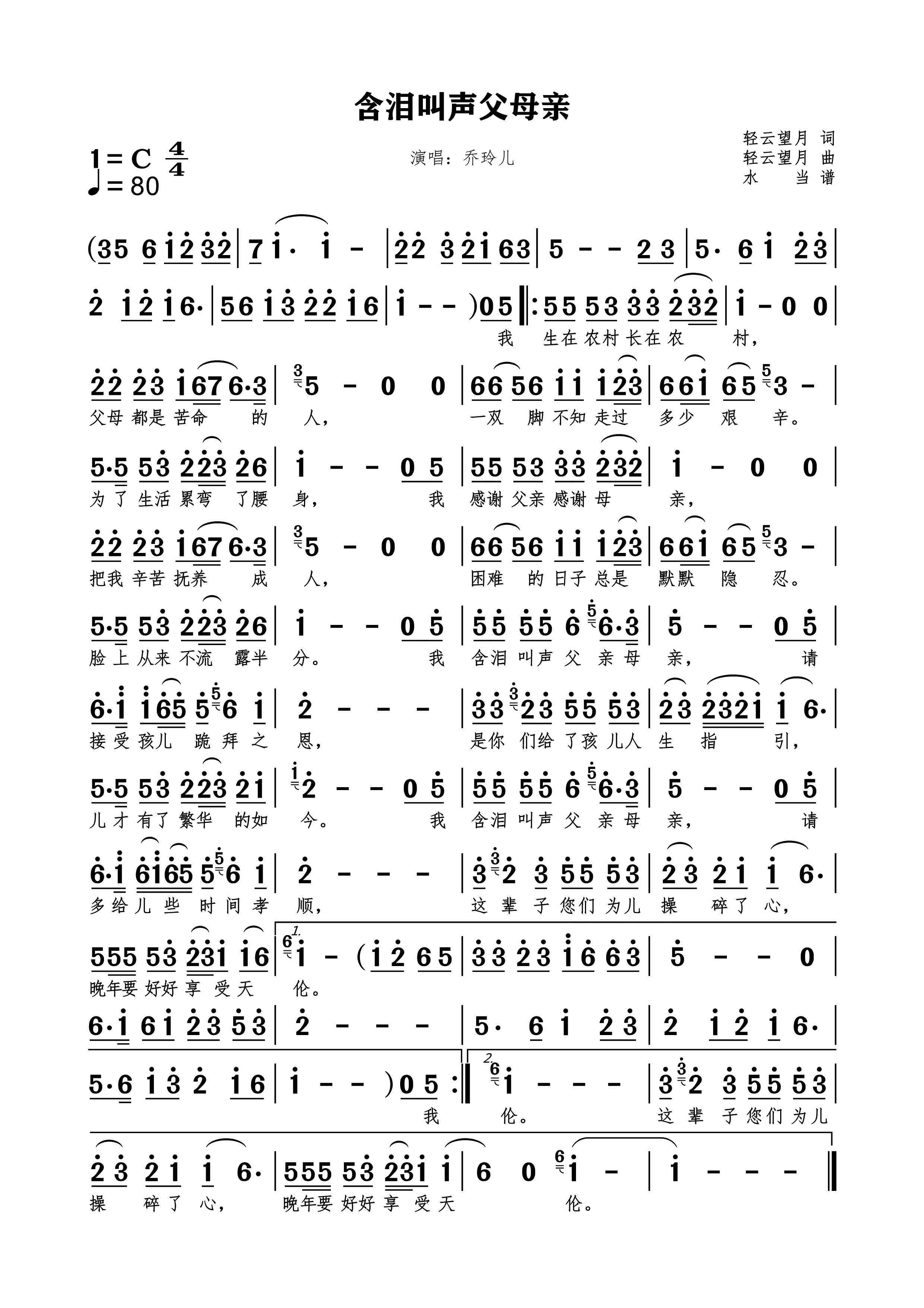含泪叫声父母亲简谱下载乔玲儿演唱轻云望月作词作曲附歌词
